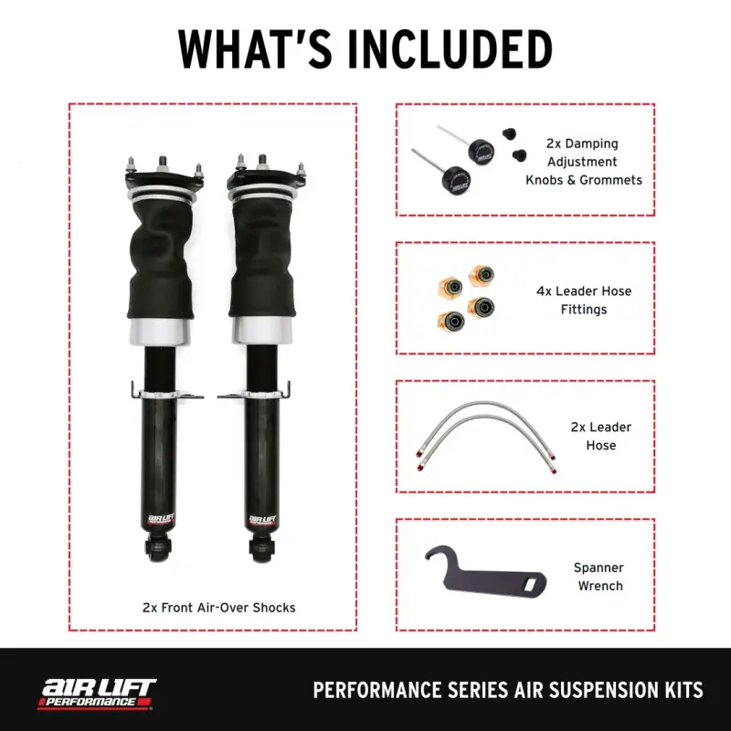 Get the stance you want and the performance you need with Air Lift’s Performance air suspension kits! Every kit we offer is fully engineered to properly fit your vehicle, provide unmatched static drop, and deliver ride and handling capability that exceeds factory suspensions. No other lowering suspension provides a more versatile package for daily use. Get your Nissan Z down! With 3.5 of drop and all the versatility of air, the Air Lift Performance kit is the best choice for show stance AND daily driving. Get the looks you crave with the performance you need! Kit Features Drop = 93mm/3.57 Custom double bellow air springs 30-way damping adjustable front air-over shocks Red anodized aluminum upper mounts Modifications Required: Indenting inside of front shock tower for air spring clearance Included with Each Kit Pair of front air-over shocks with 30-level damping adjustment Braided stainless steel leader hoses 1/4 & 3/8 PTC fittings All mounting hardware Detailed instruction manual Air Lift’s 1-year warranty and excellent customer support